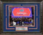 This framed photo features Florida Gators - National Champions. Handcrafted in the USA by skilled artisans. Perfectly fitted in a stylish frame to match any room in your home or office. Featuring deluxe Faux Banner Suede and Pumpkin cream core beveled matting. The frame measures 23 x 19 x 1. This collectible is ready to display on your home or office wall today!