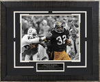 This framed photo features Franco Harris - Pittsburgh Steelers - The Immaculate Reception. Handcrafted in the USA by skilled artisans. Perfectly fitted in a stylish frame to match any room in your home or office. Featuring deluxe Focus Suede and Frosty White cream core beveled matting. The frame measures 23 x 19 x 1. This collectible is ready to display on your home or office wall today!