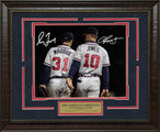 This framed photo features Greg Maddux and Chipper Jones Spotlight with Facsimile Signature. Handcrafted in the USA by skilled artisans. Perfectly fitted in a stylish frame to match any room in your home or office. Featuring deluxe Faux Navy Suede and Holiday Red cream core beveled matting. The frame measures 23 x 19 x 1. This collectible is ready to display on your home or office wall today!