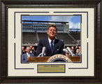 This framed photo features John F Kennedy - We Choose The Moon. Handcrafted in the USA by skilled artisans. Perfectly fitted in a stylish frame to match any room in your home or office. Featuring deluxe Peppered Cream and Navy cream core beveled matting. The frame measures 18 x 25.5 x 1. This collectible is ready to display on your home or office wall today!