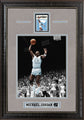 This exceptional piece commemorates the electrifying career of Michael Jordan, capturing his rising success with the University of North Carolina. Measuring 18 x 25.5 x 1, it's elegantly presented in a frame adorned with luxurious Faux Peppered Cream, Soft Blue, and Navy cream core beveled matting, exuding sophistication and style.