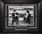 This framed photo features Muhammad Ali vs Sylvester Stallone. Handcrafted in the USA by skilled artisans. Perfectly fitted in a stylish frame to match any room in your home or office. Featuring deluxe Focus Suede and TV Gray cream core beveled matting. The frame measures 23 x 19 x 1. This collectible is ready to display on your home or office wall today!