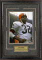 This framed photo features Jim Brown - The Football Standard. Handcrafted in the USA by skilled artisans. Perfectly fitted in a stylish frame to match any room in your home or office. Featuring deluxe Bar Harbor and Acorn cream core beveled matting. The frame measures 18 x 25.5 x 1. This collectible is ready to display on your home or office wall today!