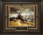 Johnny Cash - Folsom Prison - On Stage. Handcrafted in the USA by skilled artisans. Perfectly fitted in a stylish frame to match any room in your home or office. Featuring deluxe Faux Brownie Suede and Palazzo cream core beveled matting. The frame measures 23 x 19 x 1. This collectible is ready to display on your home or office wall today!