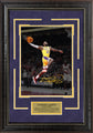 This framed photo features  LeBron James - NBA JAM - Spotlight with Facsimile Signature. Handcrafted in the USA by skilled artisans. Perfectly fitted in a stylish frame to match any room in your home or office. Featuring deluxe Faux Purple Suede and  Gold Rush cream core beveled matting. The frame measures 18 x 25.5 x 1. This collectible is ready to display on your home or office wall today!