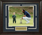 This framed photo features Scottie Scheffler & Son - 2025 Open Championship. Handcrafted in the USA by skilled artisans. Perfectly fitted in a stylish frame to match any room in your home or office. Featuring deluxe Faux Navy Suede and Peppered Cream cream core beveled matting. The frame measures 23 x 19 x 1. This collectible is ready to display on your home or office wall today!