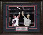 This framed photo features Drake Maye & Tom Brady - New England Patriots - Passing the Torch. Handcrafted in the USA by skilled artisans. Perfectly fitted in a stylish frame to match any room in your home or office. Featuring deluxe Faux Navy Suede and Holiday Red cream core beveled matting. The frame measures 18 x 17 x 1. This collectible is ready to display on your home or office wall today!