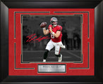 This framed photo features Baker Mayfield - Tampa Bay Buccaneers - Spotlight with Facsimile Signature. Handcrafted in the USA by skilled artisans. Perfectly fitted in a stylish frame to match any room in your home or office. Featuring deluxe Holiday Red Suede and Tru Black cream core beveled matting. The frame measures 23 x 19 x 1. This collectible is ready to display on your home or office wall today!