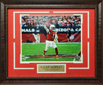 This framed photo features Kyler Murray - Arizona Cardinals. Handcrafted in the USA by skilled artisans. Perfectly fitted in a stylish frame to match any room in your home or office. Featuring deluxe Faux Cherry Red Suede and Frosty White cream core beveled matting. The frame measures 23 x 19 x 1. This collectible is ready to display on your home or office wall today!