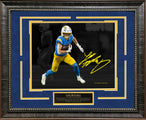 This framed photo features Ladd McConkey - Los Angeles Chargers - Spotlight with Facsimile Signature. Handcrafted in the USA by skilled artisans. Perfectly fitted in a stylish frame to match any room in your home or office. Featuring deluxe Faux Banner Suede and Gold Rush cream core beveled matting. The frame measures 23 x 19 x 1. This collectible is ready to display on your home or office wall today!