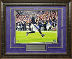 This framed photo features Lamar Jackson - Baltimore Ravens. Handcrafted in the USA by skilled artisans. Perfectly fitted in a stylish frame to match any room in your home or office. Featuring deluxe Faux Purple Suede and Tru Black cream core beveled matting. The frame measures 23 x 19 x 1. This collectible is ready to display on your home or office wall today!