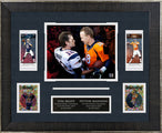 This framed photo features Tom Brady & Peyton Manning with Rep Tickets and LTD GRF Cards. Handcrafted in the USA by skilled artisans, this collectible includes two replica tickets and a limited-edition Gold Refractor card of each legendary quarterback—limited to only 50 cards each. Both cards come with a certificate of authenticity. It is perfectly fitted in a stylish frame that complements any room in your home or office. The frame features deluxe Faux Navy Suede and Frosty White cream core beveled matting and measures 23 x 19 x 1. Ready to display, this collectible is the perfect addition to your wall today!