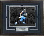 This framed photo features Tony Pollard - Tennessee Titans - Spotlight. Handcrafted in the USA by skilled artisans. Perfectly fitted in a stylish frame to match any room in your home or office. Featuring deluxe Faux Navy Red Suede and Soft Blue cream core beveled matting. The frame measures 23 x 19 x 1. This collectible is ready to display on your home or office wall today!
