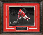 This framed photo features Xavier Worthy - Kansas City Chiefs - Spotlight with Facsimile Signature. Handcrafted in the USA by skilled artisans. Perfectly fitted in a stylish frame to match any room in your home or office. Featuring deluxe Faux Cherry Suede and Frosty White cream core beveled matting. The frame measures 23 x 19 x 1. This collectible is ready to display on your home or office wall today!