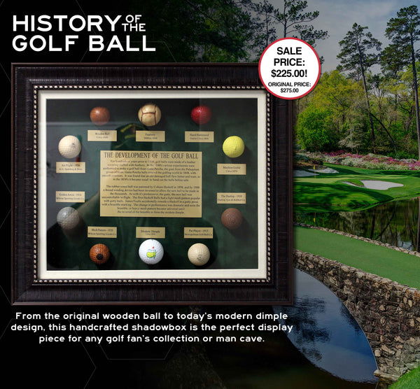 This framed photo features History of the Golf Ball - Shadowbox. Handcrafted in the USA by skilled artisans. Perfectly fitted in a stylish frame to match any room in your home or office. Featuring deluxe Faux Zucchini Suede and Frosty White cream core beveled matting. The frame measures 18 x 15.25. This collectible is ready to display on your home or office wall today!