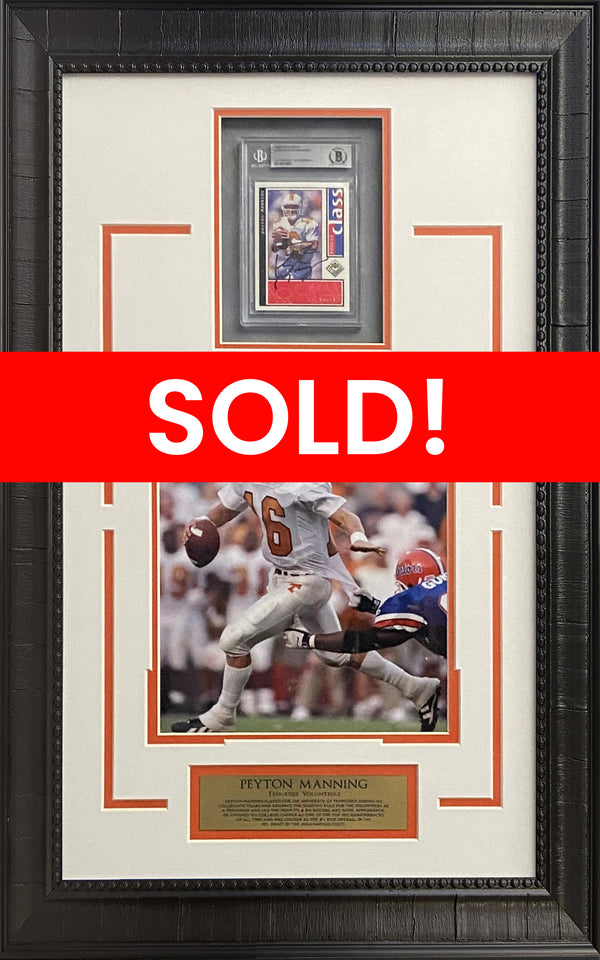 This autographed card framed photo is a must-have for any Peyton Manning fan or memorabilia collector, offering a perfect blend of historical significance and elegant presentation.