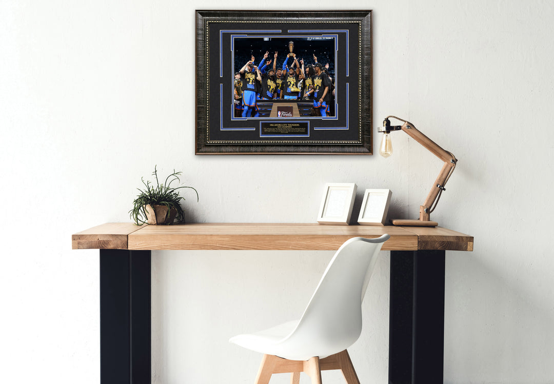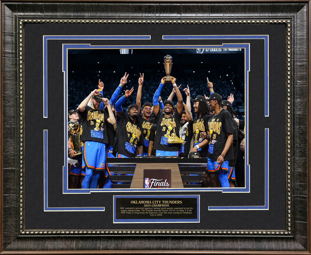 This framed photo features the Oklahoma City Thunder - 2025 NBA Champions - Spotlight. Handcrafted in the USA by skilled artisans. Perfectly fitted in a stylish frame to match any room in your home or office. Featuring deluxe Focus Suede and Electric Blue cream core beveled matting. The frame measures 23 x 19 x 1. This collectible is ready to display on your home or office wall today!