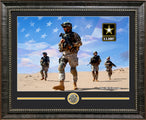 This framed photo features the U.S. Army 250th Anniversary with Commemorative Coin. Handcrafted in the USA by skilled artisans. Perfectly fitted in a stylish frame to match any room in your home or office. Featuring deluxe Focus Suede and Gold Rush cream core beveled matting and a commemorative coin, celebrating the United States Army 250th anniversary. The frame measures 23 x 19 x 1. This collectible is ready to display on your home or office wall today!