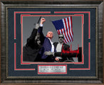 Presenting an extraordinary piece of memorabilia commemorating a pivotal moment in modern history. This framed photograph captures President Donald J. Trump during a critical event where he survived an assassination attempt. This piece is not only a striking addition to any collection but also a tribute to a significant moment in the life of the 45th President of the United States.
