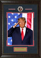This framed photo features President Donald J Trump with a Commemorative Coin. Handcrafted in the USA by skilled artisans. Perfectly fitted in a stylish frame to match any room in your home or office. Featuring a commemorative coin with President Donald J. Trump and a deluxe Faux Navy Suede and Holiday Red cream core beveled matting. The frame measures 13 x 19 x 1. This collectible is ready to display on your home or office wall today!