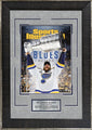 This framed photo features St. Louis Blues - Blues Heaven - Si Cover. Handcrafted in the USA by skilled artisans. Perfectly fitted in a stylish frame to match any room in your home or office. Featuring deluxe Faux Oxford Suede and Navy cream core beveled matting. The frame measures 18 x 25.5 x 1. This collectible is ready to display on your home or office wall today!