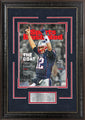 This framed photo features Tom Brady - The GOAT Says Goodbye - Si Cover. Handcrafted in the USA by skilled artisans. Perfectly fitted in a stylish frame to match any room in your home or office. Featuring deluxe Faux Navy Suede and Holiday Red cream core beveled matting. The frame measures 18 x 25.5 x 1. This collectible is ready to display on your home or office wall today!