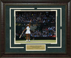 This framed photo features  Serena Williams - 23 Grand Slams. Handcrafted in the USA by skilled artisans. Perfectly fitted in a stylish frame to match any room in your home or office. Featuring deluxe Faux Zucchini Suede and Peppered Cream cream core beveled matting. The frame measures 23 x 19 x 1. This collectible is ready to display on your home or office wall today!