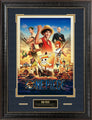 This framed photo features the One Piece Live Action Movie Poster. Handcrafted in the USA by skilled artisans. Perfectly fitted in a stylish frame to match any room in your home or office. Featuring deluxe Faux Navy Suede and Palazzo cream core beveled matting. The frame measures 22.5 x 25.5 x 1. This collectible is ready to display on your home or office wall today!